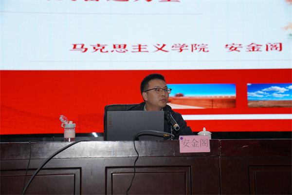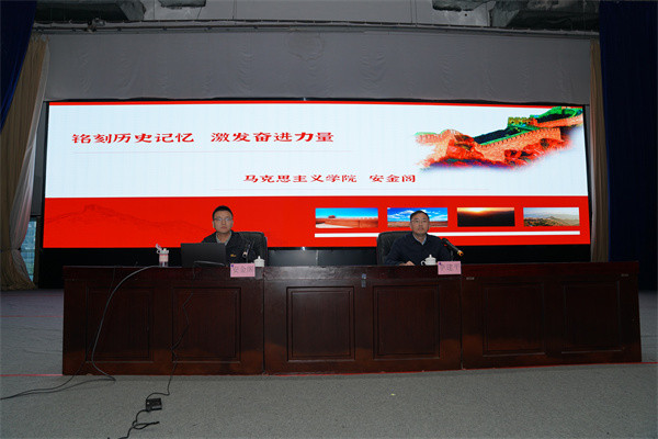 為深入學(xué)習(xí)貫徹習(xí)近平新時代中國特色社會主義思想,進一步加強學(xué)校“大思政”工作,培養(yǎng)德智體美勞全面發(fā)展的社會主義建設(shè)者和接班人,根據(jù)學(xué)?!暗掠笾v堂”活動安排, 11月1日下午,馬克思主義學(xué)院安金閣老師為全校師生開設(shè)了《銘刻歷史記憶,激發(fā)奮進力量》的專題講座。講座由學(xué)生工作處副處長李建平主持,馬克思主義學(xué)院負責人金純峰、相關(guān)學(xué)院學(xué)管院長、學(xué)管科長,馬克思主義學(xué)院全體教師及學(xué)生代表在主會場參會,各班級分會場線上參會。