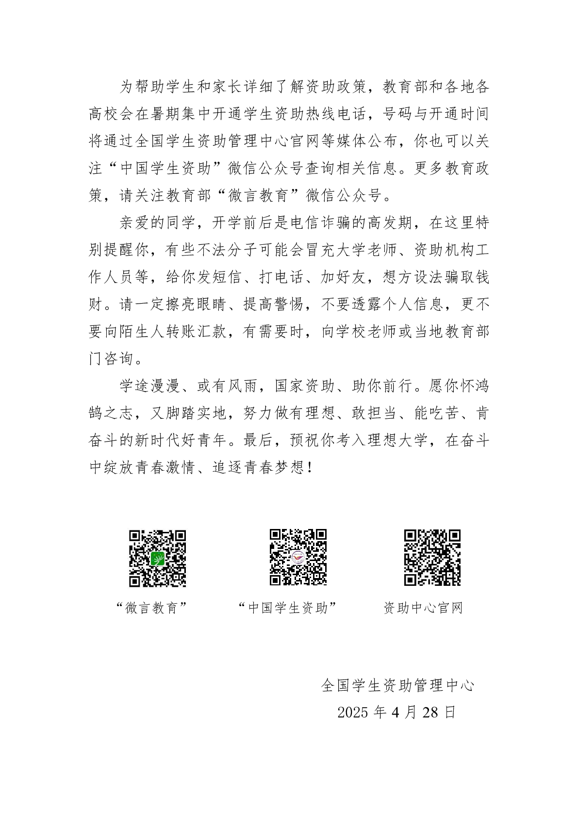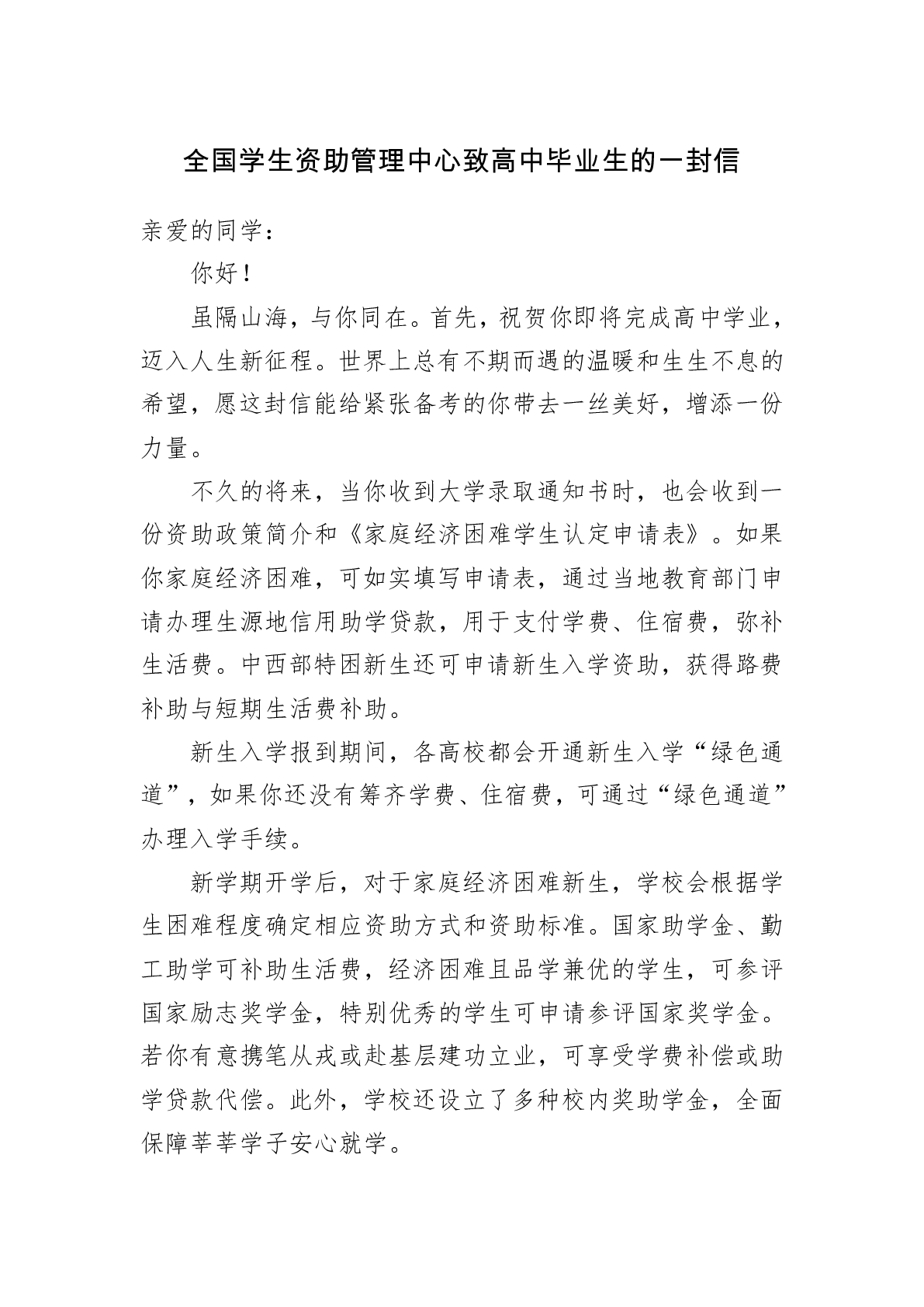 全國學(xué)生資助管理中心致高中畢業(yè)生的一封信