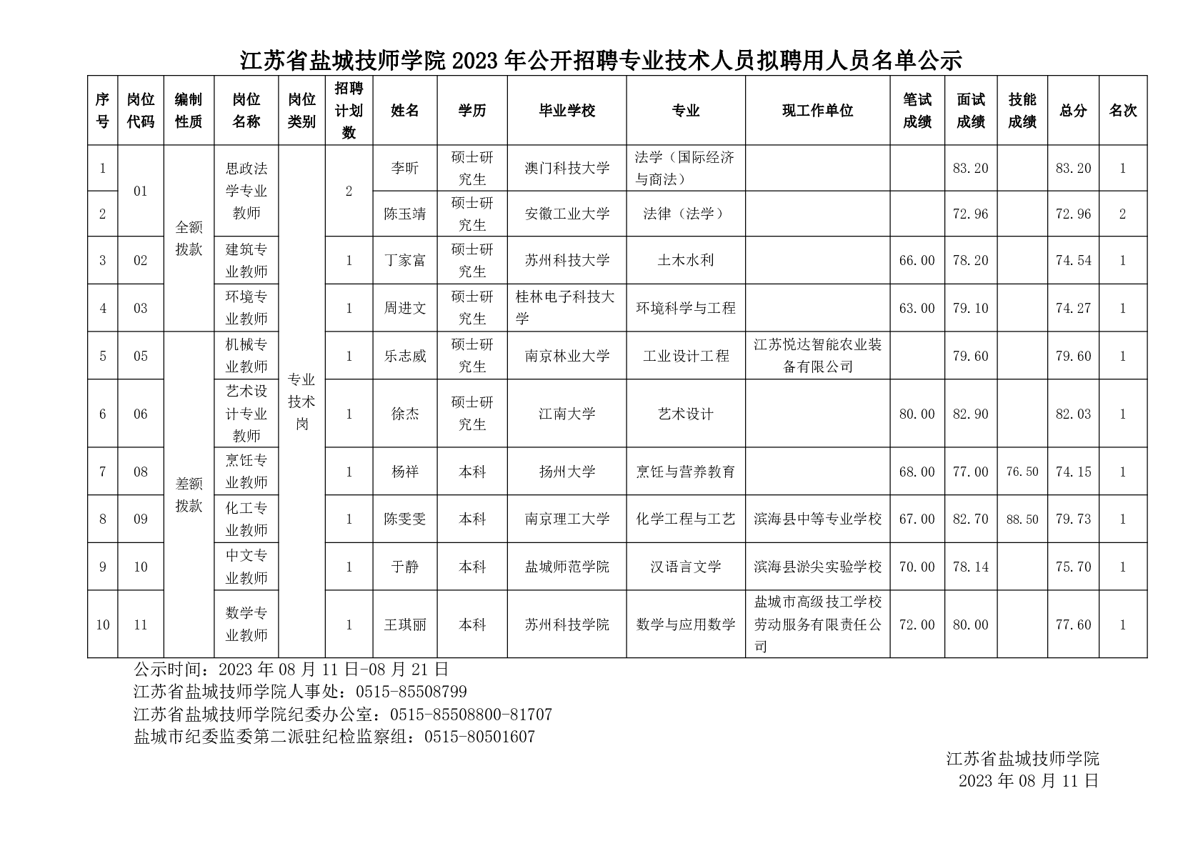 江蘇省鹽城技師學(xué)院2023年公開(kāi)招聘專業(yè)技術(shù)人員擬聘用人員名單公示