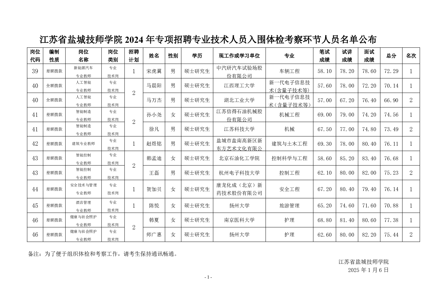 江蘇省鹽城技師學(xué)院2024年專項(xiàng)招聘專業(yè)技術(shù)人員入圍體檢考察環(huán)節(jié)人員名單公布