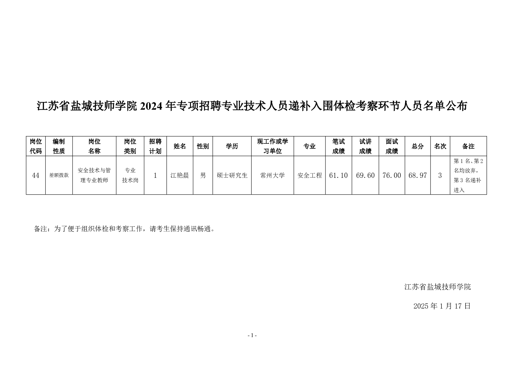 江蘇省鹽城技師學院2024年專項招聘專業(yè)技術(shù)人員遞補入圍體檢考察環(huán)節(jié)人員名單公布